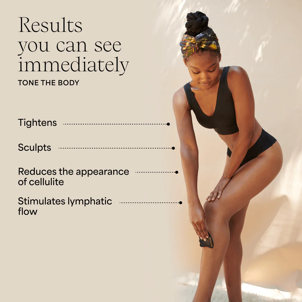 Patented body gua sha tool designed to tighten, tone, sculpt, and smooth the skin.  It helps to stimulate energy flow, release tension, and smooth dimpled skin.